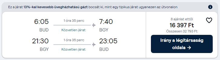 Az árak a megosztás pillanatában érvényesek, mivel az olcsó repülőjegyekből csak minimális darab áll rendelkezésre egy adott időpontra. A légitársaságok a szabad helyek függvényében módosíthatják áraikat. A repülőjegy ára a legalacsonyabb kategóriára vonatkozik és tartalmaz 1 ingyenesen felvihető kisméretű kézitáskát/hátizsákot. További részletek a légitársaság weboldalán.