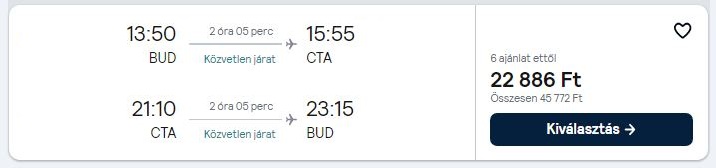 Az árak a megosztás pillanatában érvényesek, mivel az olcsó repülőjegyekből csak minimális darab áll rendelkezésre egy adott időpontra. A légitársaságok a szabad helyek függvényében módosíthatják áraikat. A repülőjegy ára a legalacsonyabb kategóriára vonatkozik és tartalmaz 1 ingyenesen felvihető kisméretű kézitáskát/hátizsákot. További részletek a légitársaság weboldalán.