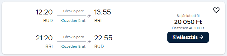 Az árak a megosztás pillanatában érvényesek, mivel az olcsó repülőjegyekből csak minimális darab áll rendelkezésre egy adott időpontra. A légitársaságok a szabad helyek függvényében módosíthatják áraikat. A repülőjegy ára a legalacsonyabb kategóriára vonatkozik és tartalmaz 1 ingyenesen felvihető kisméretű kézitáskát/hátizsákot. További részletek a légitársaság weboldalán.