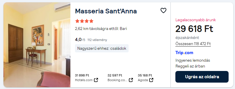 Repülőjegy + szállás reggelivel = 79.285 Ft/fő