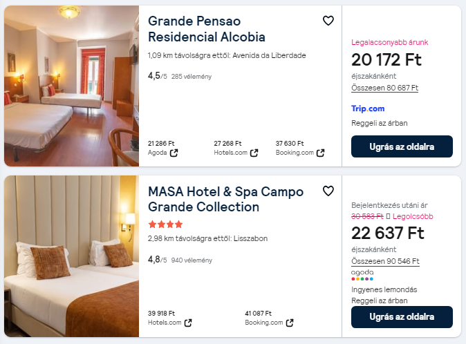 Egyéb időpontok – indulás Budapestről ⇆ Lisszabonba