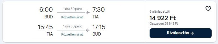 Az árak a megosztás pillanatában érvényesek, mivel az olcsó repülőjegyekből csak minimális darab áll rendelkezésre egy adott időpontra. A légitársaságok a szabad helyek függvényében módosíthatják áraikat. A repülőjegy ára a legalacsonyabb kategóriára vonatkozik és tartalmaz 1 ingyenesen felvihető kisméretű kézitáskát/hátizsákot. További részletek a légitársaság weboldalán.