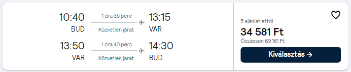 Az árak a megosztás pillanatában érvényesek, mivel az olcsó repülőjegyekből csak minimális darab áll rendelkezésre egy adott időpontra. A légitársaságok a szabad helyek függvényében módosíthatják áraikat. A repülőjegy ára a legalacsonyabb kategóriára vonatkozik és tartalmaz 1 ingyenesen felvihető kisméretű kézitáskát/hátizsákot. További részletek a légitársaság weboldalán.