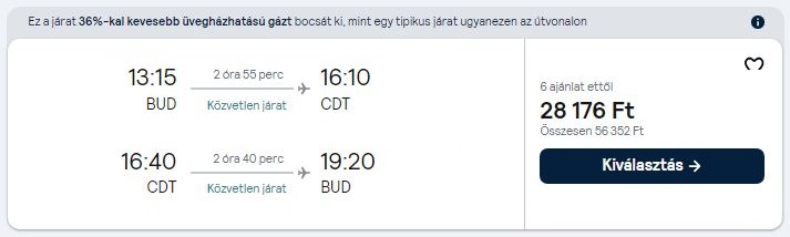 Az árak a megosztás pillanatában érvényesek, mivel az olcsó repülőjegyekből csak minimális darab áll rendelkezésre egy adott időpontra. A légitársaságok a szabad helyek függvényében módosíthatják áraikat. A repülőjegy ára a legalacsonyabb kategóriára vonatkozik és tartalmaz 1 ingyenesen felvihető kisméretű kézitáskát/hátizsákot. További részletek a légitársaság weboldalán.