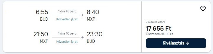 Az árak a megosztás pillanatában érvényesek, mivel az olcsó repülőjegyekből csak minimális darab áll rendelkezésre egy adott időpontra. A légitársaságok a szabad helyek függvényében módosíthatják áraikat. A repülőjegy ára a legalacsonyabb kategóriára vonatkozik és tartalmaz 1 ingyenesen felvihető kisméretű kézitáskát/hátizsákot. További részletek a légitársaság weboldalán.
