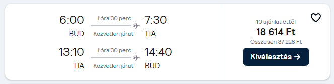 Az árak a megosztás pillanatában érvényesek, mivel az olcsó repülőjegyekből csak minimális darab áll rendelkezésre egy adott időpontra. A légitársaságok a szabad helyek függvényében módosíthatják áraikat. A repülőjegy ára a legalacsonyabb kategóriára vonatkozik és tartalmaz 1 ingyenesen felvihető kisméretű kézitáskát/hátizsákot. További részletek a légitársaság weboldalán.