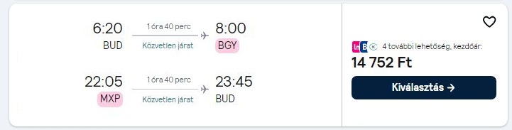 1 napos retúr repülőjegy Budapestről ⇆ Milánóba (Olaszország)