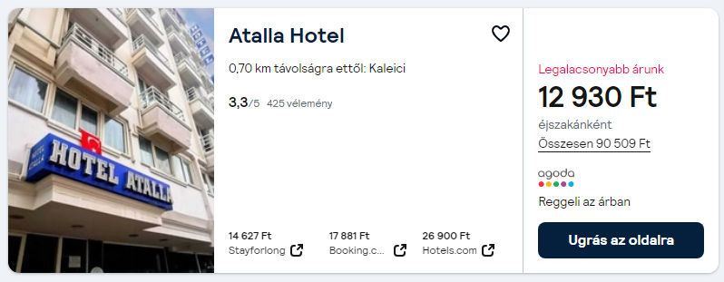 A repjegy és szállás árakat a lenti linkekre kattintva tudod ellenőrizni és foglalni! Mivel ez az utazási tipp 2025.10.13. óta nem frissült, ezért az árak változhattak. Érdemes ellenőrizni az összes kilistázott repülőjegy árát. Ha elsőként szeretnél értesülni új olcsó utazási tippekről, kapcsold be a böngésző értesítést a weboldalon! Ha szeretnél olcsó utazni, kövess minket Facebookon és nézd meg a legfrissebb utazási tippjeinket itt!