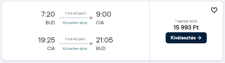 Az árak a megosztás pillanatában érvényesek, mivel az olcsó repülőjegyekből csak minimális darab áll rendelkezésre egy adott időpontra. A légitársaságok a szabad helyek függvényében módosíthatják áraikat. A repülőjegy ára a legalacsonyabb kategóriára vonatkozik és tartalmaz 1 ingyenesen felvihető kisméretű kézitáskát/hátizsákot. További részletek a légitársaság weboldalán.