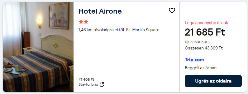 Repülőjegy + szállás reggelivel = 36.550 Ft/fő